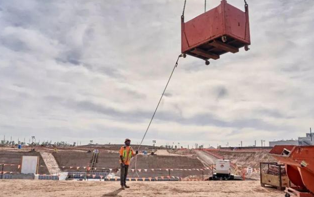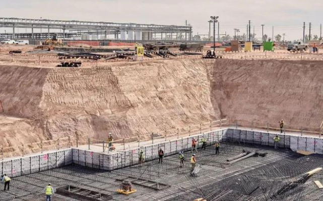 起重機(jī)在錢德勒工地搬運(yùn)建筑材料。除其他外,這些起重機(jī)將為新晶圓廠吊裝 55 噸冷水機(jī)?!?
