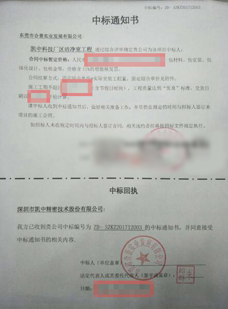 喜訊傳來,東莞市合景實(shí)業(yè)發(fā)展有限公司成功中標(biāo)深圳市凱中精密技術(shù)股份有限公司凱中科技廠區(qū)潔凈室工程。工程采取包材料、包安裝、包深化設(shè)計(jì)的合作形式,工期為60天。
